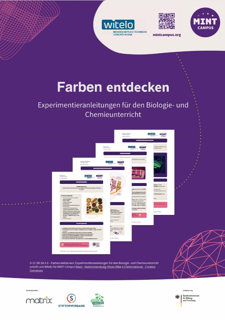 Weiternutzung als OER ausdrücklich erlaubt: Dieses Werk und dessen Inhalte sind - sofern nicht anders angegeben - lizenziert unter CC BY-SA 4.0. Nennung gemäß TULLU-Regel bitte wie folgt: "Farben entdecken: Experimente für den Chemie- und Biologieunterricht" erstellt von Witelo für MINT-Campus, Lizenz: CC BY-SA 4.0.